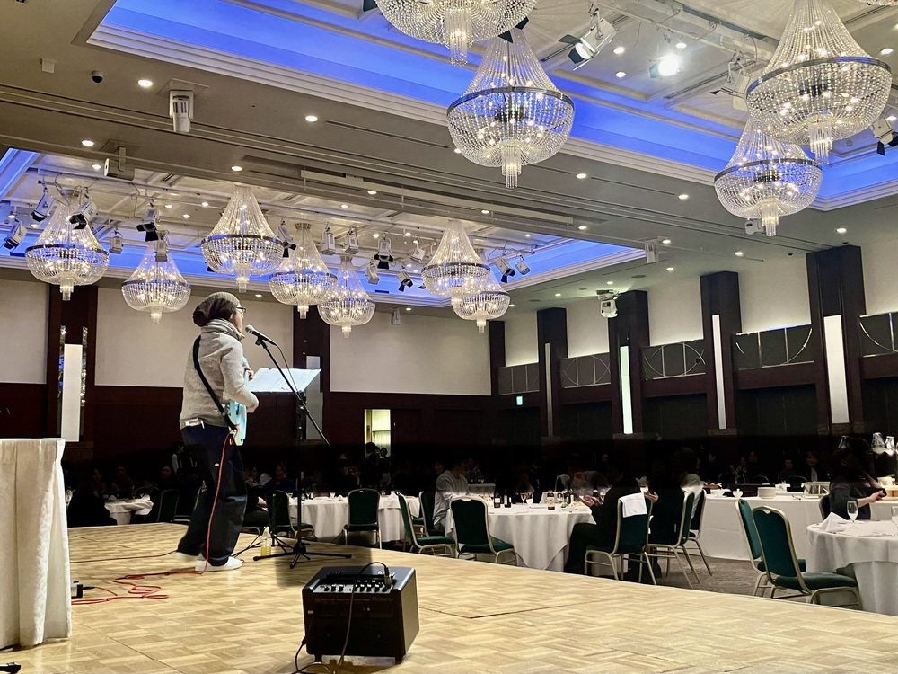 富山ターミナルビル、マリエ、マルート、とやマルシェの4館合同テナント懇親会に参加させていただきました。シャンデリアが並ぶ大きな会場で、170名ほどの各店舗関係者の皆さんが来られて、楽しいひとときのなか、B'zのイチブトゼンブ、オリジナル曲たまにはを歌いました。また嬉しいアンコールをいただき、主催のご好意により、B'zのlove me,i love youをやらせていただくことになりました。皆さんと盛り上がってとても楽しいステージになりました。